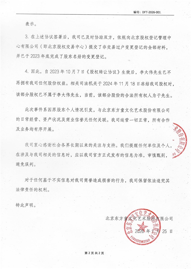 此次事件系因原股东个人情况引发,与北京东方童文化艺术股份有限公司的日常经营、资产状况及商业信誉无任何关联。我司运营一切正常,所有合作及业务均有序开展。