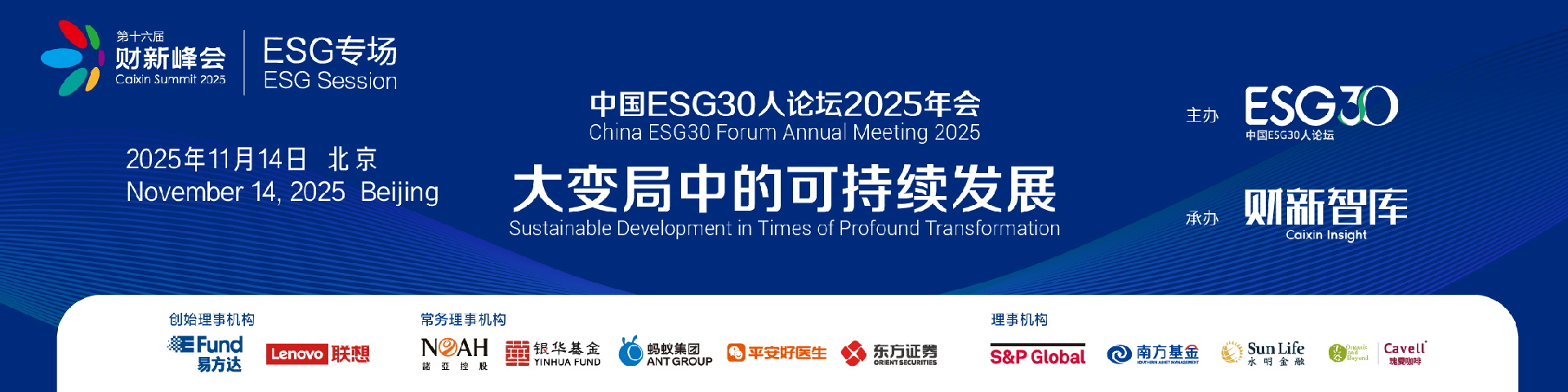 11月14日,第十六届财新峰会ESG专场暨中国ESG30人论坛2025年会“大变局中的可持续发展”在北京举办。负责任投资原则(PRI)CEO大卫·阿特金(David Atkin),原芝加哥气候交易所(CCX)创始人、碳交易之父、金融期货之父理查德·桑德尔(Richard Sandor),财政部原副部长朱光耀,中金公司原总裁兼首席执行官、清华大学管理实践访问教授朱云来,原中国银保监会副主席、全国社保基金理事会原副理事长陈文辉,中国投资有限责任公司原副董事长、总经理兼首席投资官高西庆,中国在非企业社会责任联盟执行主席刁春和,香港科技大学(广州)碳中和和气候变化学域教授、署理主任姜克隽,清华大学国家金融研究院院长田轩,清华大学公共管理学院教授、清华大学产业发展与环境治理研究中心主任陈玲等政界、学界、国际机构嘉宾以及来自东方证券、香港永明金融有限公司、世界黄金协会、联想集团、深圳能源集团、愉悦资本、AEX控股公司等国内外企业、金融与行业机构的代表出席会议并发言,共同探讨了ESG投资、碳市场、中国绿色转型定力、养老金金融潜力和耐心资本培育、长期价值创造、可持续创新解决方案及产业化规模化路径等关键问题。