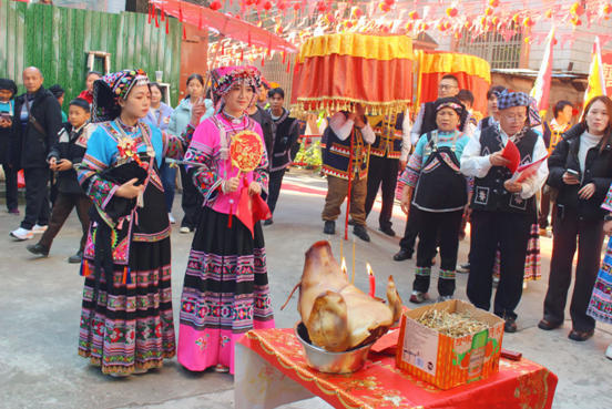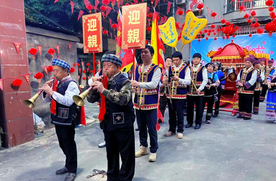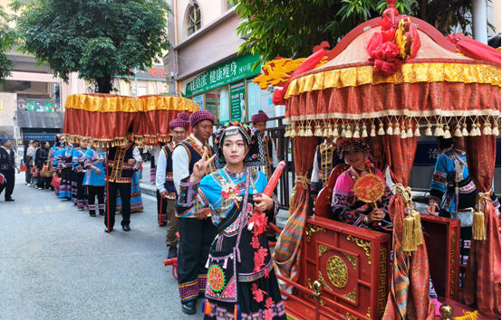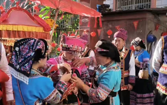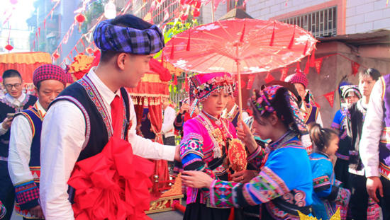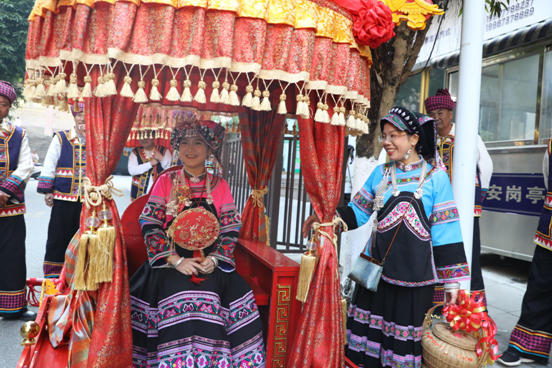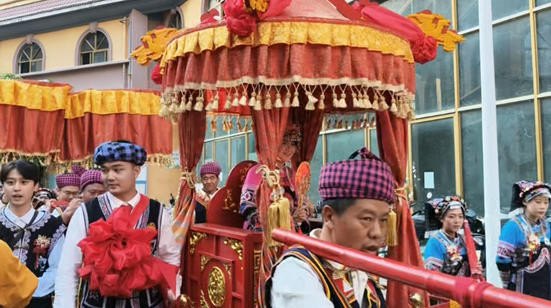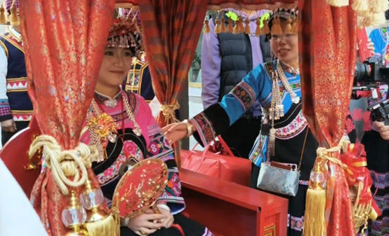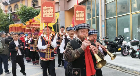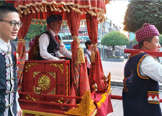 按布依民族的传统婚俗,新娘子出嫁当天大多为骑马前行,由于河口县城属于城市街区,日常禁止大型动物通行。于是便自我服从城市管理,将骑马改成八抬大轿。
