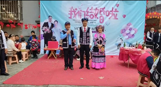 礼仪王华武主持道:“现在是男方家向女方家的亲友敬茶。由男方接亲人端茶水敬女方亲友,敬茶时唱敬茶歌(优哎优)。女方亲友接茶杯后,也唱一首歌回谢”。