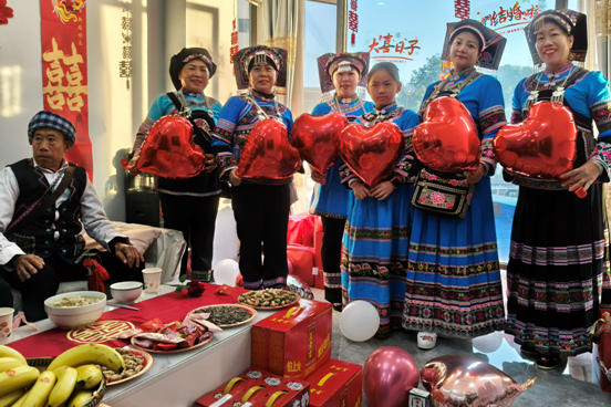 大家都围过来看闹热,同时在家等候迎新娘的布依族妹妹柏贵媛赶快抬着一碗汤圆上前喂一口新娘,这叫甜甜蜜蜜,团团圆圆,像征着来到婆婆家吃穿不愁,夫妻恩爱长长久久。