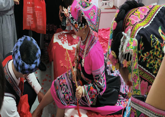 年轻人在新娘屋里与新娘做游戏......等待差不多时,新娘就要该出门了。新娘出门时,都是穿好了的新娘装。新娘的盛装早在清晨六点便已穿戴妥当,负责穿衣的,是特意挑选的福气妇人——身体健康、夫妻和睦、子女安康,寓意把满满福气传给新人。