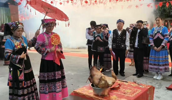 喝完茶后,由礼仪王华武主持认亲,他说道:“认亲是布族的优秀文化,即利用结婚的机会,新娘认识新郎家的亲人,亲人同时教育他们夫妻如何做人做事,对新婚夫妻进行训戒。同时,从此时此刻起,新娘要改口叫新郎的父母为爸妈。认亲顺序为先敬祖辈,再敬双亲,依次是爷爷奶奶,外公外婆,父亲母亲,大爹大妈,舅爷舅妈,姑爹姑妈。”