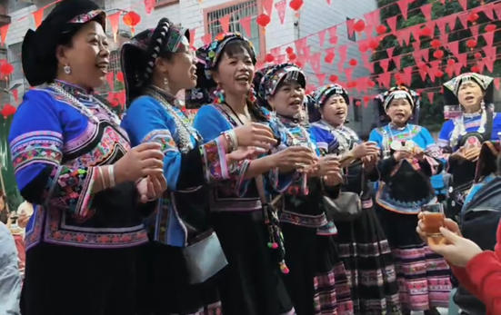途中《小过街》《大过街》《新过街》唢呐调子婉转悠扬,锣声铿锵相伴,一路慢行,一路欢歌。众人沐着暖阳赏新送福,欢声笑语伴着民俗韵律,将满心欢喜与美好祝愿,一同送往新郎家中,每一步都承载着布依婚俗的庄重与温情,满是岁月静好的幸福模样。