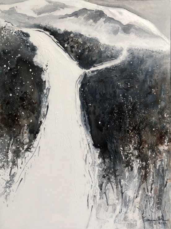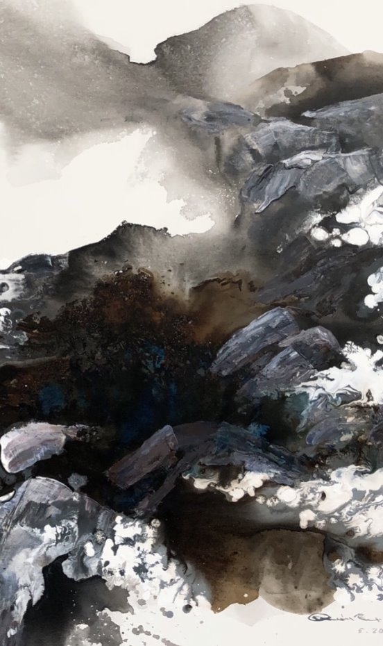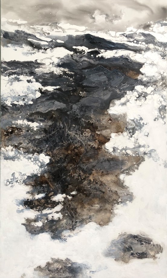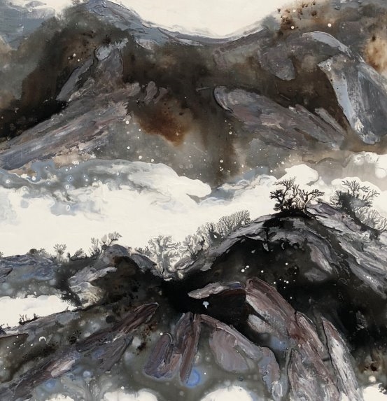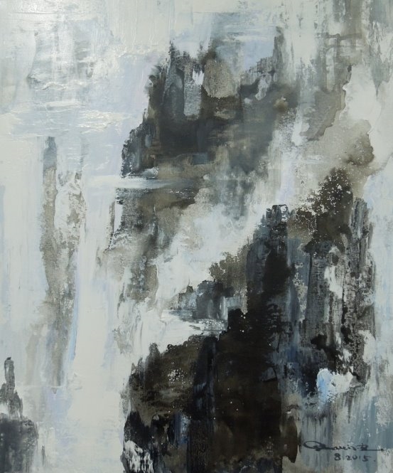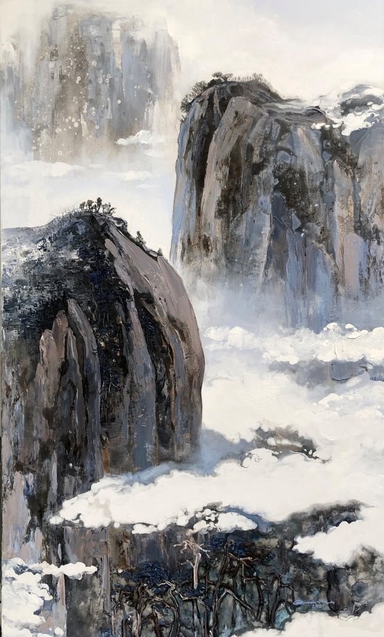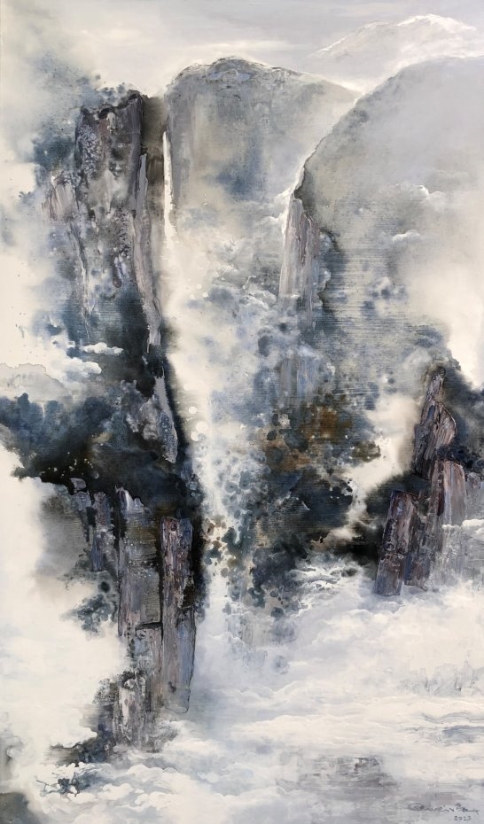 他的绘画发展可以分为三个方向,第一个是以綜合材料表现水墨精神,将抽象与传统山水画完美融合,主要以灰、白色和细腻的土色调,来表现山脈的粗犷地形和风起云湧的狂野动态.画作中巧妙地平行了流动性与稳定性,让观者既能感受到大自然的巨大力量,又能体会到作品中那瀰漫着的宁静氛围。他对色彩和形式的运用展现了非凡的掌控力,尤其是那斑驳层叠的岩石质感和水一样流动的云雾效果,使他的作品充满深度,他通过对自然世界的抽象描绘,引领观者深入体验其对自然环境的关怀与沉思。