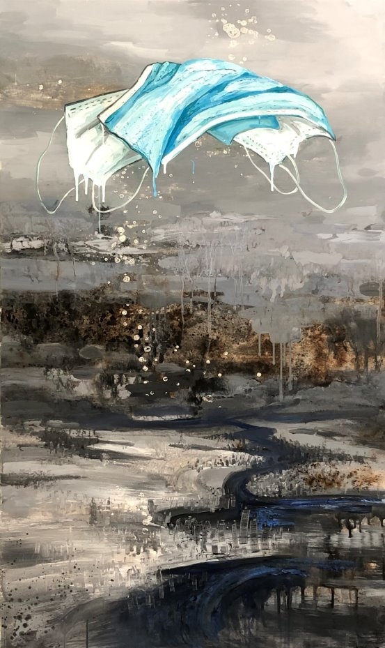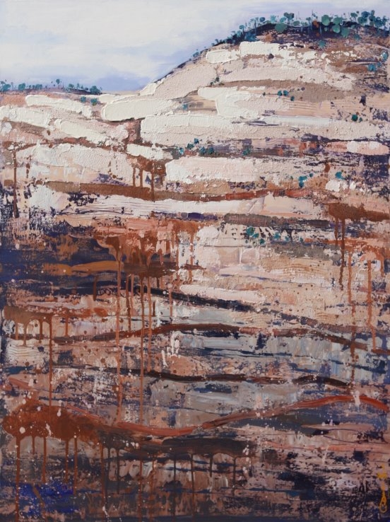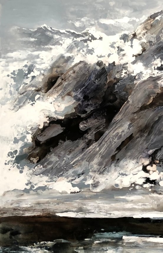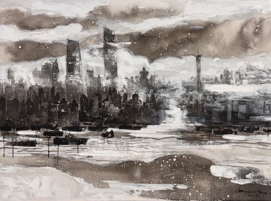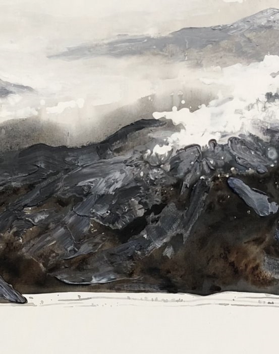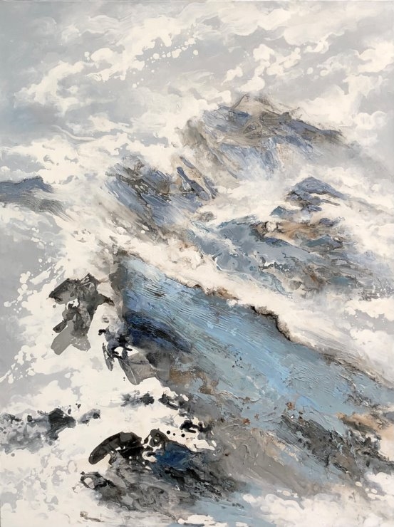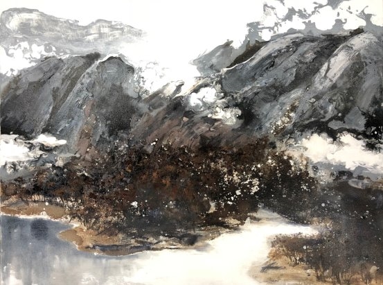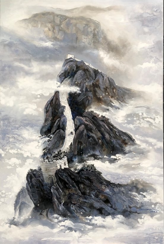 他的绘画发展可以分为三个方向,第一个是以綜合材料表现水墨精神,将抽象与传统山水画完美融合,主要以灰、白色和细腻的土色调,来表现山脈的粗犷地形和风起云湧的狂野动态.画作中巧妙地平行了流动性与稳定性,让观者既能感受到大自然的巨大力量,又能体会到作品中那瀰漫着的宁静氛围。他对色彩和形式的运用展现了非凡的掌控力,尤其是那斑驳层叠的岩石质感和水一样流动的云雾效果,使他的作品充满深度,他通过对自然世界的抽象描绘,引领观者深入体验其对自然环境的关怀与沉思。