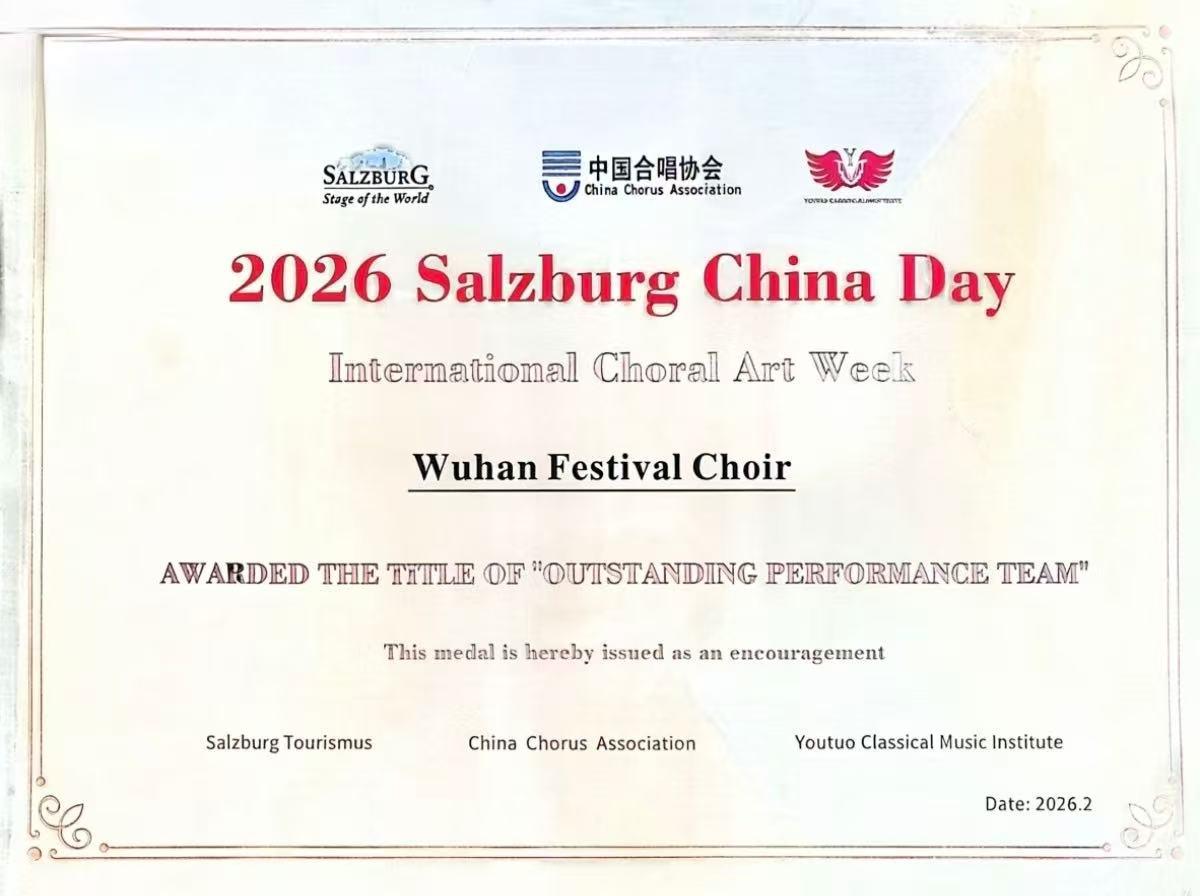歌声为媒,文化为桥。此次2026萨尔茨堡中国日・国际合唱艺术周的精彩亮相,是湖北武汉合唱艺术的一次重要突破,更是中奥文化交流的一段美好佳话。未来,相信湖北武汉的合唱艺术将继续以歌为翼,飞向更广阔的世界舞台,让更多人听见来自长江之滨的动人旋律!(作者:李婕)