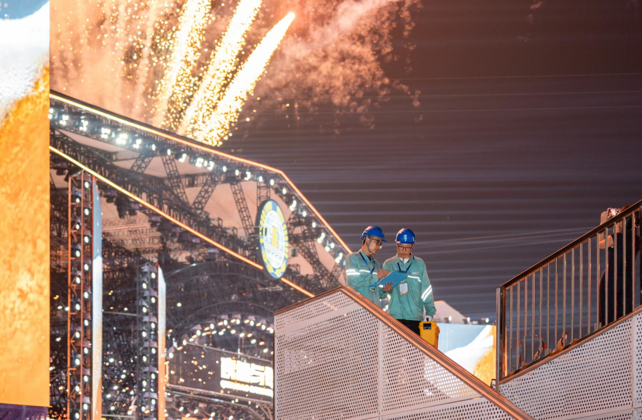开幕式当晚,金沙滩啤酒城中心舞台的巨型网幕屏突然亮起,一只3D虚拟啤酒桶破屏而出,向世界发出开怀畅饮的邀约。裸眼3D秀巨幕的后方,国网青岛供电公司员工薛俊涛正蜷身在电缆沟持续监测设备用电情况。“演艺现场灯光全开时,瞬时功耗会迅速攀升,这时候最容易发生故障。”薛俊涛说。像薛俊涛这样默默守护在金沙滩啤酒城用电保障工作一线的工作人员,还有44名。他们组成了“保电突击队”,建立起“15分钟应急响应圈”,使用便携式局放检测仪从狂欢声浪中捕捉细微的供电设备异常放电音,确保第一时间消除用电隐患。